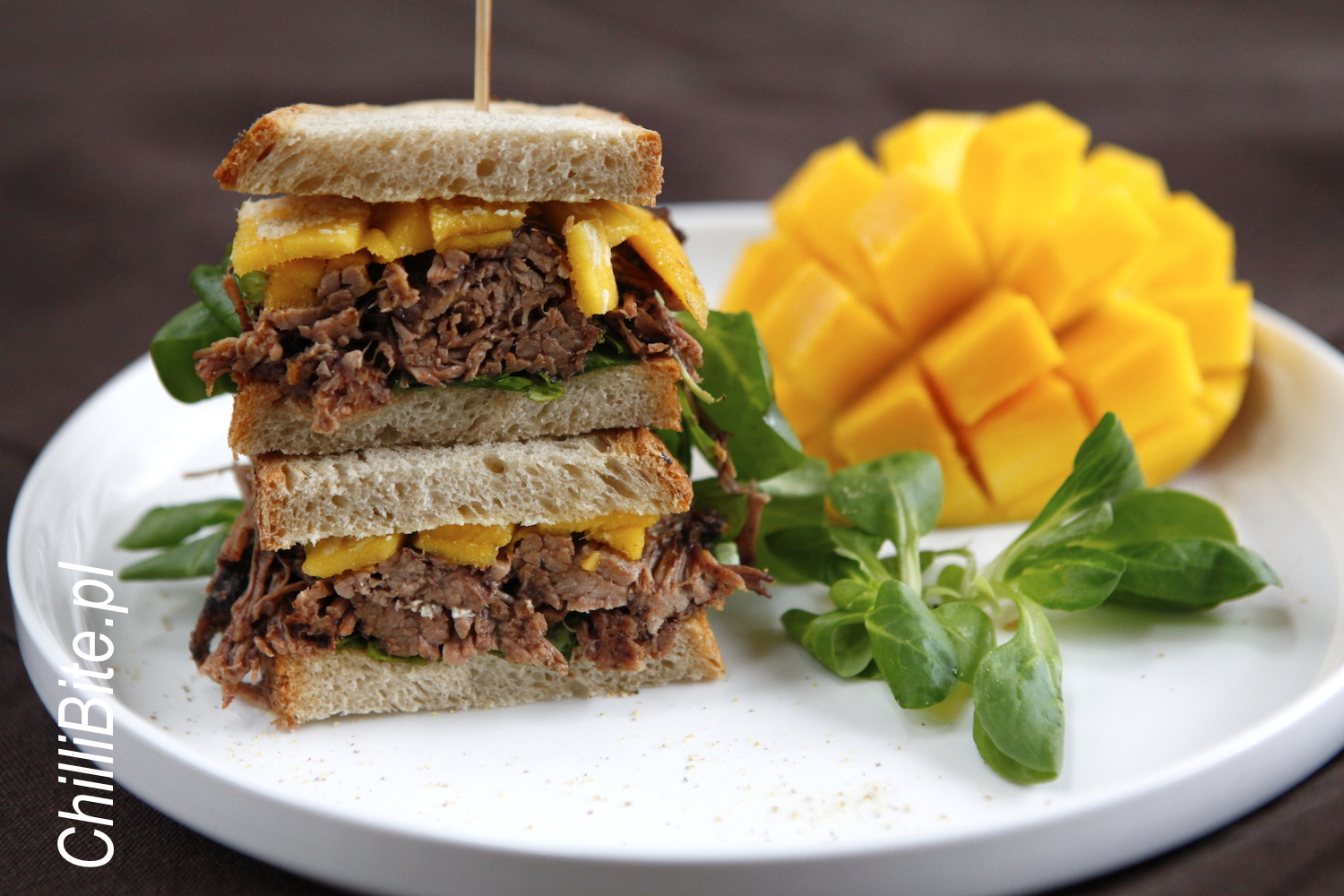 Czekoladowy pulled pork składaj w wielkie, soczyste kanapki: chrupiące kromki chleba, liście roszponki, jeszcze gorące, soczyste włókna mięsa + ulubione dodatki: pesto paprykowe, plastry soczystego mango, nieco chrzanu w śmietanie. Wyśmienite!