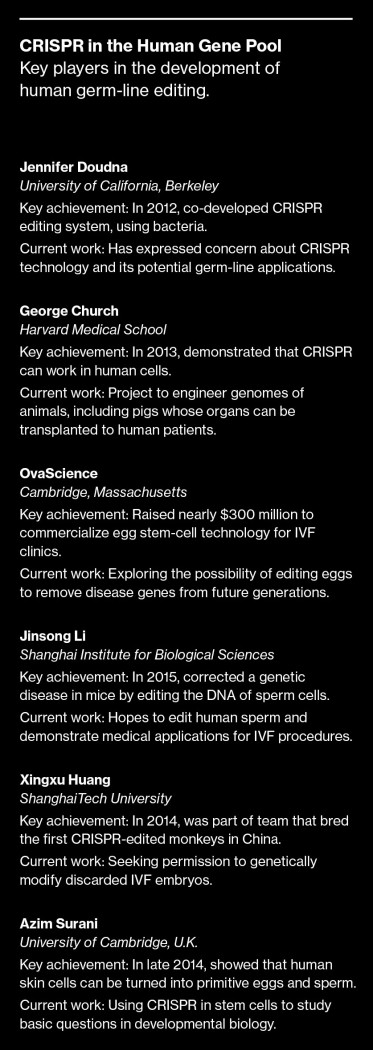 Just three years after its initial development, CRISPR technology is already widely used by biologists as a kind of search-and-replace tool to alter DNA, even down to the level of a single letter. It’s so precise that it’s expected to turn into a promising new approach for gene therapy in people with devastating illnesses. The idea is that physicians could directly correct a faulty gene, say, in the blood cells of a patient with sickle-cell anemia (see “Genome Surgery”). But that kind of gene therapy wouldn’t affect germ cells, and the changes in the DNA wouldn’t get passed to future generations.
