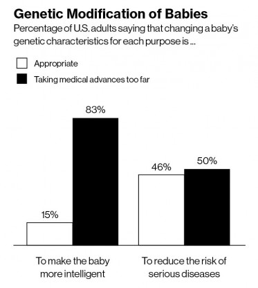 Some thinkers have concluded that we should not pass up the chance to make improvements to our species. “The human genome is not perfect,” says John Harris, a bioethicist at Manchester University, in the U.K. “It’s ethically imperative to positively support this technology.” By some measures, U.S. public opinion is not particularly negative toward the idea. A Pew Research survey carried out last August found that 46 percent of adults approved of genetic modification of babies to reduce the risk of serious diseases.