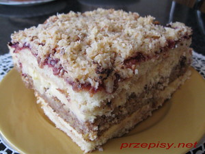 Dekoracja może być dowolna np. polewa czekoladowa, pokruszone orzechy, kakao. Ja posmarowałam drugi blat dżemem z czarnej porzeczki i zrobiłam posypkę z wiórków kokosowych: