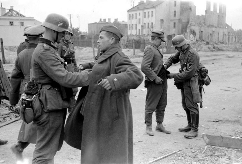 Niemieccy żołnierze przeszukują złapanych polskich jeńców wojennych.