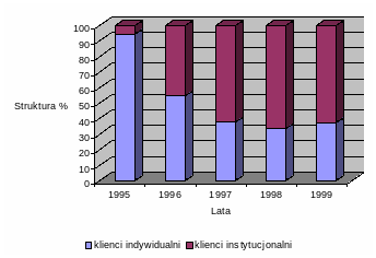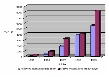 2. W latach 1995 – 1996 dominowały kredyty dla klientów indywidualnych, a w 1997 – 1999 przeważały kredyty dla klientów instytucjonalnych. Wzrosły one w 1999 roku w stosunku do 1995 – 6294,6%. Wśród nich najpopularniejsze były kredyty obrotowe, które w 1995 roku stanowiły 76,3% ogólnej wartości kredytów inwestycyjnych, a w 1999 roku – 66,1%. W kredytach obrotowych dominowały kredyty w rachunku kredytowym, które przeważały nad kredytami w rachunku bieżącym w poszczególnych latach w granicach 4 – 100%.