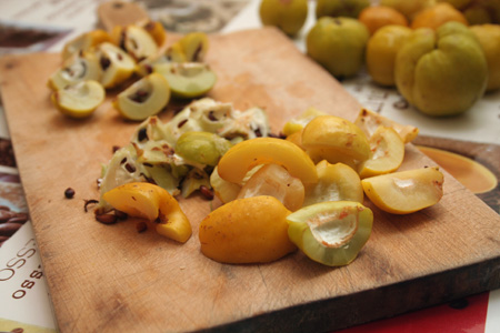 Każdą pigwę przeciąć na 4 części i pozbawić ją gniazda nasiennego