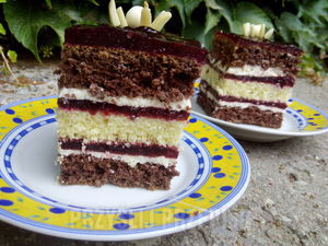 Przełożenie: Ciemny biszkopt - 1/2 masy grysikowej - 1/3 mocno tężejącej (ma się rozsmarowywać, nie może być płynna) masy wiśniowej - jasny biszkopt - 1/3 masy wiśniowej, schłodzić - druga połowa masy grysikowej - ciemny biszkopt - reszta masy wiśniowej.