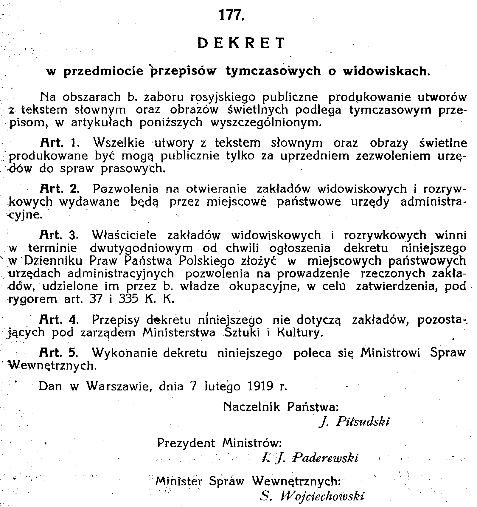 D19190177 Dekret w przedmiocie przepisów tymczasowych o widowiskach