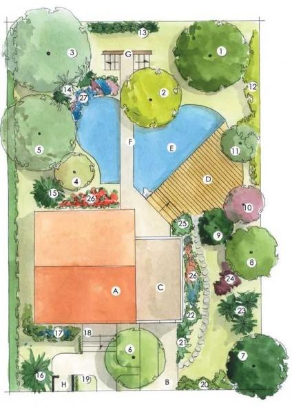 W związku z niewielkimi wymiarami działki do właściwego zagospodarowania ogrodu potrzebna jest myśl przewodnia. Tutaj zdecydowano się na rozwiązanie, w którym dominantą stał się zbiornik wodny ulokowany w tylnej części ogrodu. Pełni on funkcję salonu, przy którym właściciele będą mogli spędzać upalne letnie wieczory. Miejsce do odpoczynku zlokalizowane zostało w pobliżu południowo- zachodniego rogu budynku, na drewnianym pomoście (C). Posadzone wokół atrakcyjne drzewa, jak głóg i sofora (9, 10), z pewnością uprzyjemnią korzystanie z tego miejsca.
