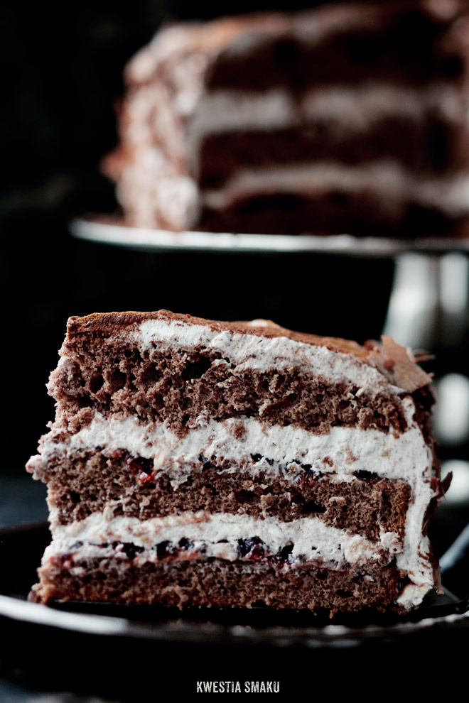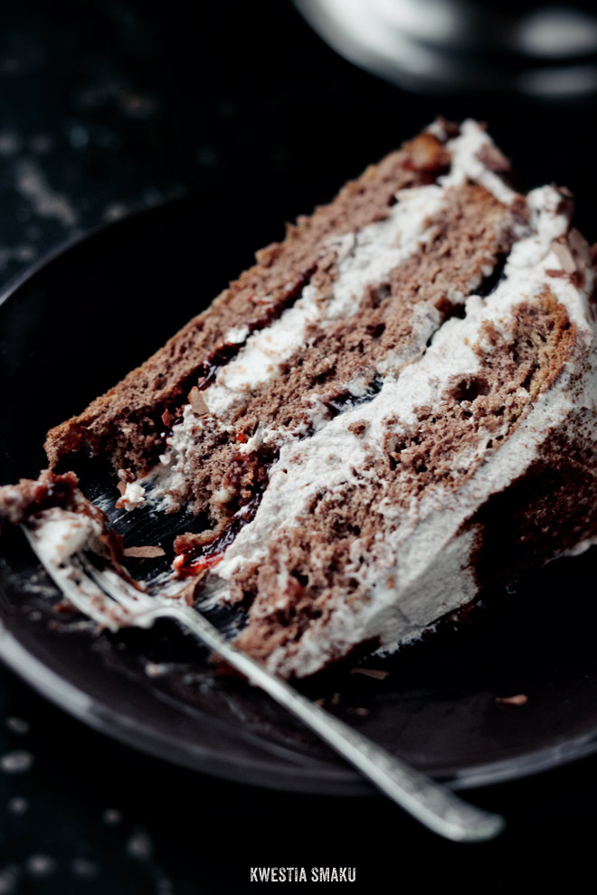 Dolny krążek biszkoptu położyć na paterze, skropić 1/3 ilości nasączenia (kilkanaście łyżeczek soku), posmarować połową powideł z likierem i wyłożyć 1/3 masy z mascarpone. Położyć drugi krążek, skropić 1/3 ilości nasączenia, posmarować resztą powideł i wyłożyć 1/3 masy. Przykryć ostatnim, górnym krążkiem, skropić go resztą nasączenia. Wierzch i boki pokryć ostatnią częścią masy.