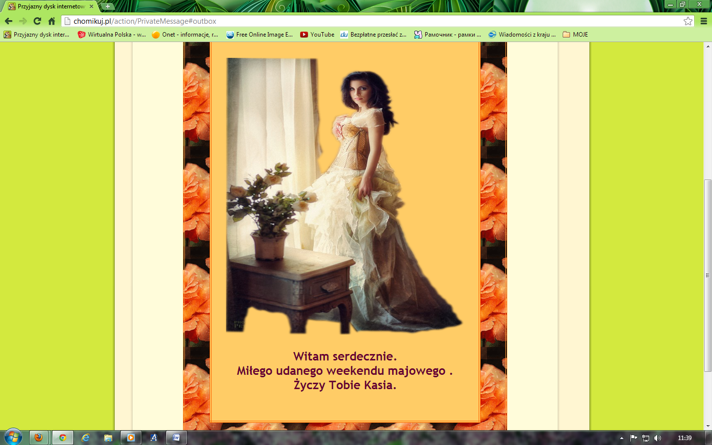 <center><table style="border:4px double #ff9933;background-image:url(http://img-fotki.yandex.ru/get/5111/goroshcko-tatjana.69/0_604fc_c1d533c3_M.gif)" cellspacing="0" cellpadding="0"><tr><td style="padding:50px"><table width="533" height="800" style="border:4px double #ff6600;background-color:#ffcc66" cellspacing="0" cellpadding="0"><tr><td style="padding:20px" align="center"><span style="color:#660033;font-size:24px"><img src="http://img-fotki.yandex.ru/get/5640/161086339.96/0_8e45a_9bb6eb3d_XL.png" height="600" width="500" style="height:600px;width:500px;" /><br /><br /><b>Witam serdecznie.<br />Miłego udanego weekendu majowego .<br/> Życzy Tobie Kasia.<br /></td></tr></table></td></tr></table>