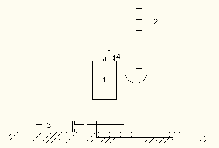 Rysunek 1. Schemat stanowiska pomiarowego. 1 – zbiornik, 2 – manometr, 3 – pompka, 4 – zawór opróżniający.