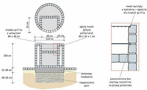 Do murowania grilla najlepiej jest użyć gotowej zaprawy do kamieni, ale może też być zaprawa cementowa. Podczas murowania należy systematycznie zmywać z kamieni zabrudzenia z zaprawy, gdyż po zaschnięciu są trudne do usunięcia.