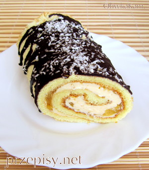 Na cieście rozsmarować dżem, a następnie ostudzony krem. Wyłożyć pokrojone brzoskwinie, zawinąć. Polać polewą czekoladową i posypać wiórkami kokosowymi.