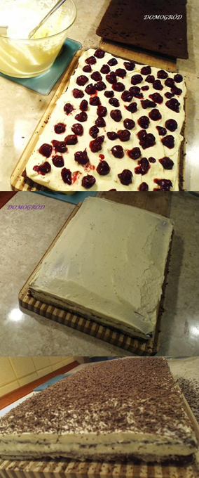 Wykładam 2/3 kremu budyniowego na spodni płat ciasta. Na krem wykładam wiśnie z dżemu domowej roboty. Przykrywam wiśnie drugim płatem ciasta. Wierzch smaruję pozostałym kremem i posypuję tartą czekoladą. Można zrobić polewę czekoladową. Wstawiam do lodówki przynajmniej na godzinę, żeby krem stężał i całość idealnie się kroiła. Murzynek z kremem budyniowym i wiśniami zawsze się sprawdzi, idealny na każdą okazję. Gorąco polecam.