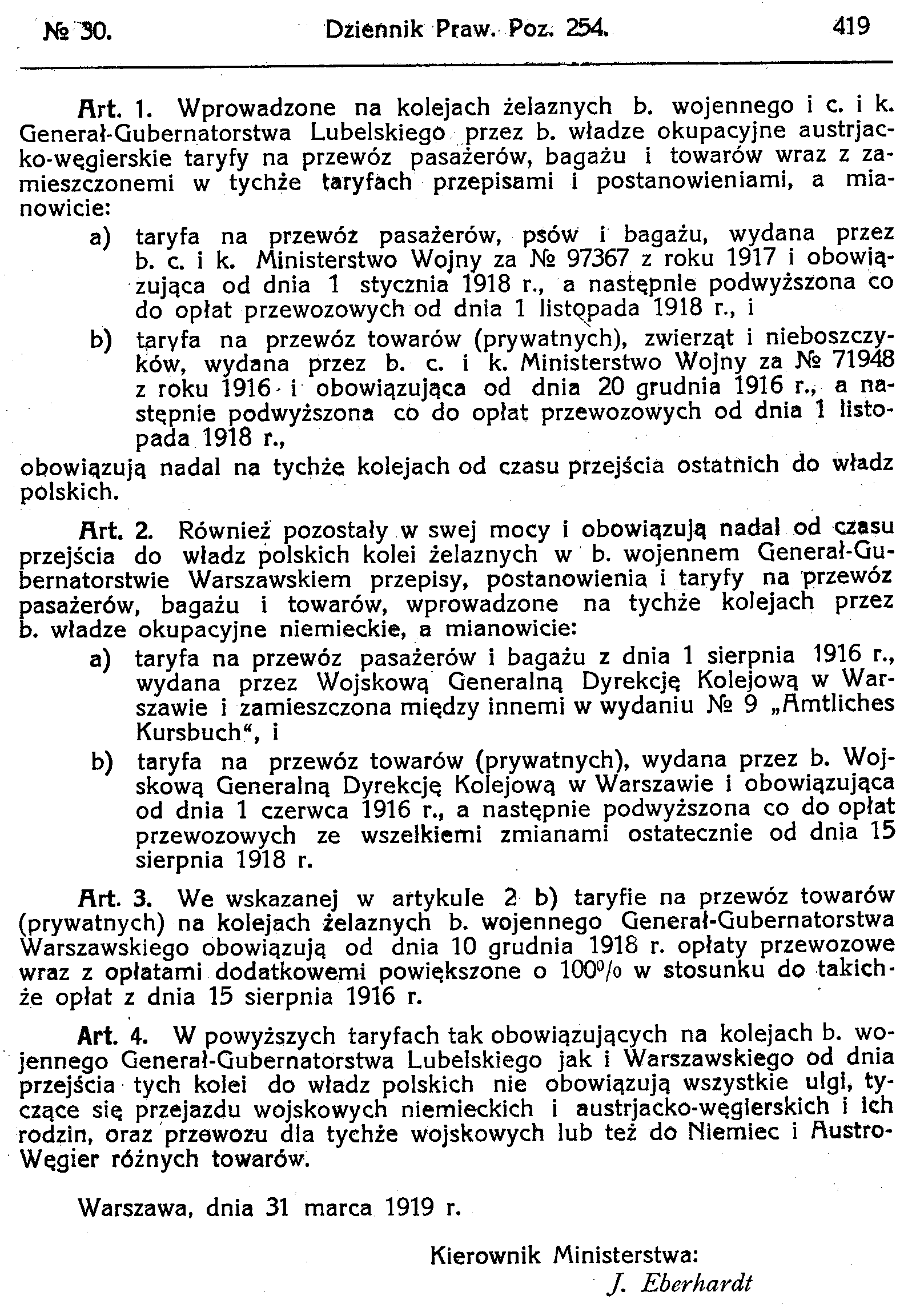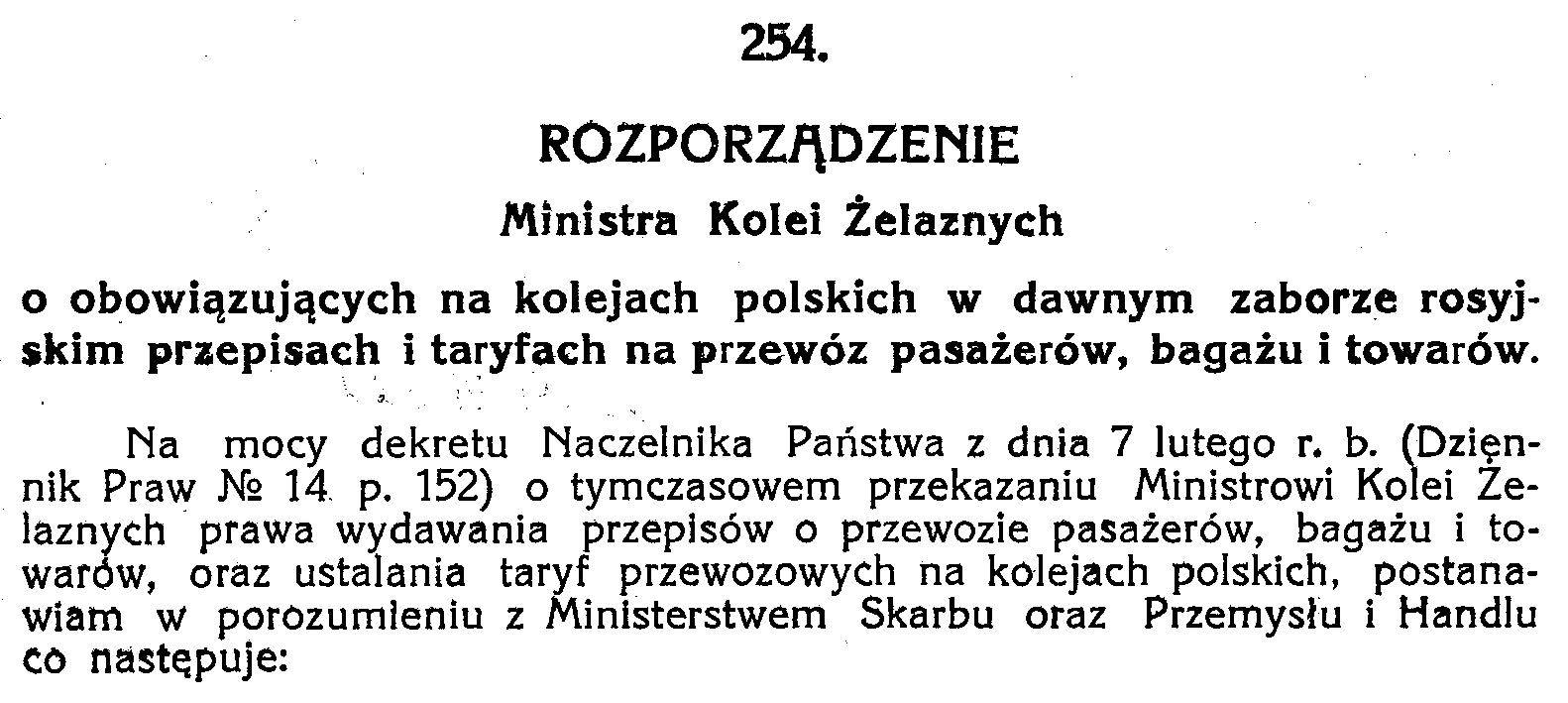 D19190254 Rozporządzenie Ministra Kolei Żelaznych o obowiązujących na kolejach polskich w dawnym zaborze rosyjskim przepisach i taryfach na przewóz pasażerów, bagażu i towarów