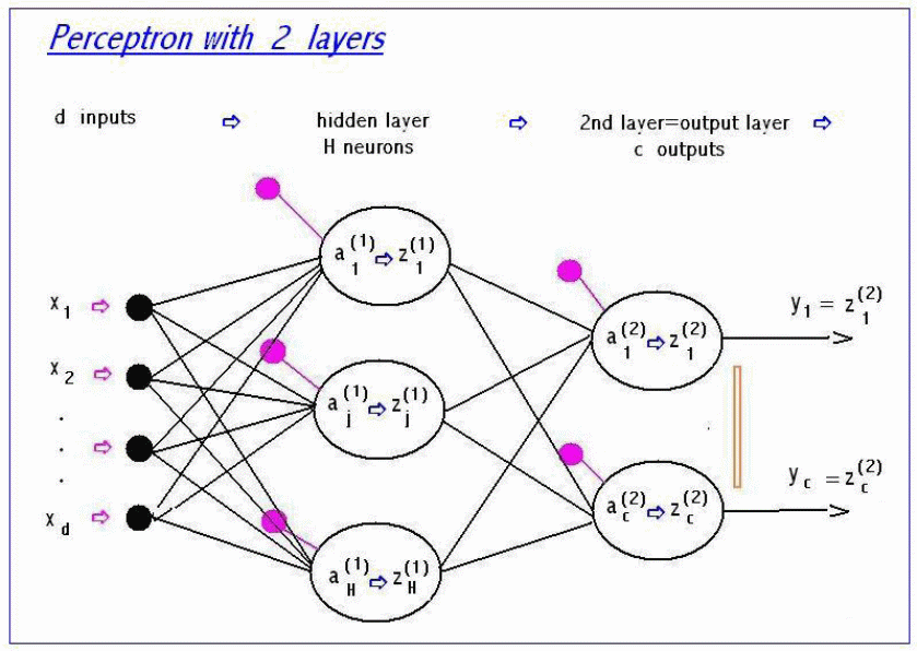 Architektura sieci MLP o d wejściach (warstwa zerowa) i 2 warstwach ukrytych, z których druga stanowi warstwę wyjściową. Podawanie informacji następuje tylko wprzód, tzn. od lewej (wejście) poprzez przetwarzanie najpierw przez neurony warstwy ukrytej pierwszej (o H neuronach). Wyniki przetwarzania w pierwszej warstwie s , a podawane jako dane wejściowe do następnej warstwy, gdzie s , a ponownie przetwarzane poprzez zadeklarowaną funkcję aktywacji. Wynik tego drugiego przetworzenia jest podawany na wyjście sieci.