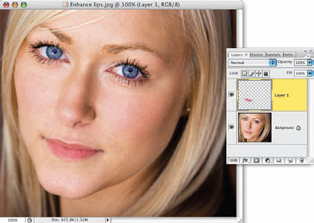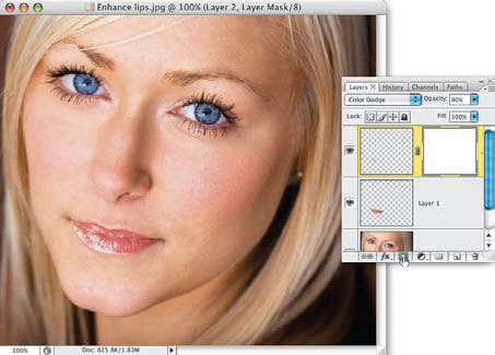 Naciśnij Ctrl+J (Mac OS: Command+J), aby skopiować zawartość zaznaczenia do nowej warstwy dokumentu (patrz obok). Teraz, aby zaakcentować ów „połysk”, należy zmienić tryb mieszania otrzymanej w ten sposób warstwy na Color Dodge (Rozjaśnianie). W opisywanym przypadku usta modelki stały się wówczas bardzo błyszczące; tak jasne, że zaczęły wyglądać bardzo nienaturalnie, szczególnie w ich dolnej części. Aby pozbyć się tego efektu, kliknij przycisk Add Layer Mask (Utwórz maskę warstwy), znajdujący się w dolnej części panelu Layers (Warstwy), włącz narzędzie Brush (Pędzel) (B), upewnij się, że bieżący kolor narzędzia został zmieniony na czarny, a następnie zamaluj dolną część ust, by w pewnym stopniu zniwelować uzyskany efekt.