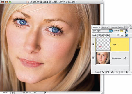 Otwórz panel Layers (Warstwy) i zmień tryb mieszania bieżącej warstwy z Normal (Zwykły) na Soft Light (Łagodne światło). Wskutek tej prostej zmiany efekt działania filtra Plastic Wrap (Foliowanie) zostanie „wtopiony” w zdjęcie, nadając ustom wyraźny