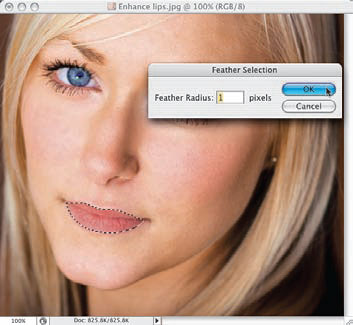 Rozpocznij od włączenia dowolnego narzędzia zaznaczania, którym lubisz się posługiwać, i utworzenia zaznaczenia, którego kontury będą pokrywały się z konturami ust (patrz zdjęcie). W celu utworzenia zaznaczenia pokazanego na rysunku użyłem narzędzia Magnetic Lasso (Lasso magnetyczne) — naciśnij Ctrl+L (Mac OS: Command+L) tyle razy, ile będzie trzeba, aby je włączyć. Akurat w tym przypadku narzędzie Magnetic Lasso (Lasso magnetyczne) spisało się wyśmienicie, gdyż kontury obiektu przeznaczonego do zaznaczenia były bardzo wyraźne. Gdy skończysz tworzenie zaznaczenia, wybierz polecenie Feather (Wtapianie) z menu Select/Modify (Zaznacz/Zmień), a gdy na ekranie pojawi się okno dialogowe tego zaznaczenia,