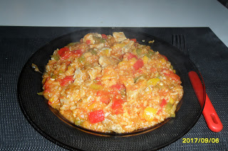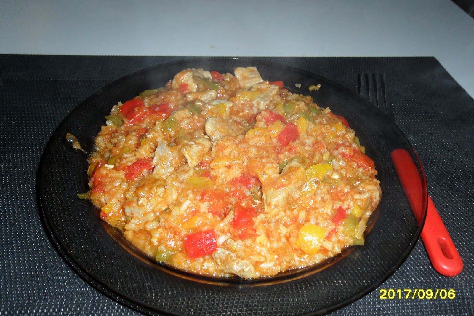 Dodać do mięsa ryż, paprykę pokrojoną w kostkę i pomidory sparzone, obrane i pokrojone w kostkę. Dodać przyprawy, przecier pomidorowy i zalać bulionem. Dusić pod przykryciem do miękkości około 35 minut, co jakiś czas mieszając. W razie potrzeby podlać delikatnie wodą.
