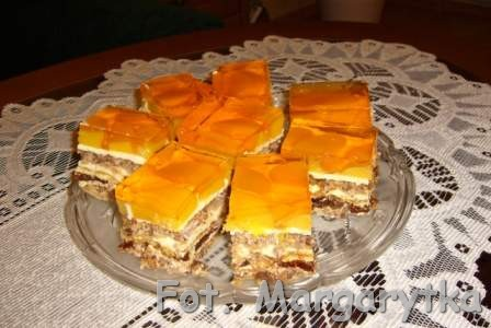 Na Delicje wyłożyć drugą część kremu i przykryć drugim plackiem. Następnie wyłożyć trzecią część kremu, pokrojone w kostkę brzoskwinie, a na wierzch ciasta wylać tężejącą galaretkę brzoskwiniową, rozpuszczoną wcześniej w 3 1/2 szklanki gorącej wody(ja galaretkę rozpuszczam dużo wcześniej, aby ostygła i zaczęła tężeć). Schłodzić w lodówce...