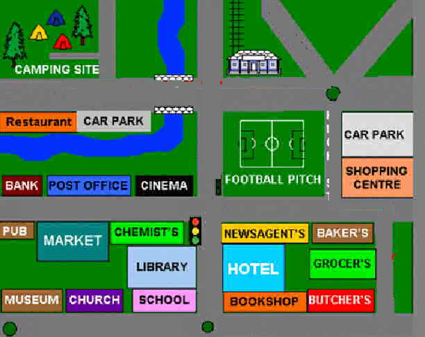 Wo sind die verschiedenen öffentliche Einrichtungen? Verwende die Präpositionen und Adverbien.