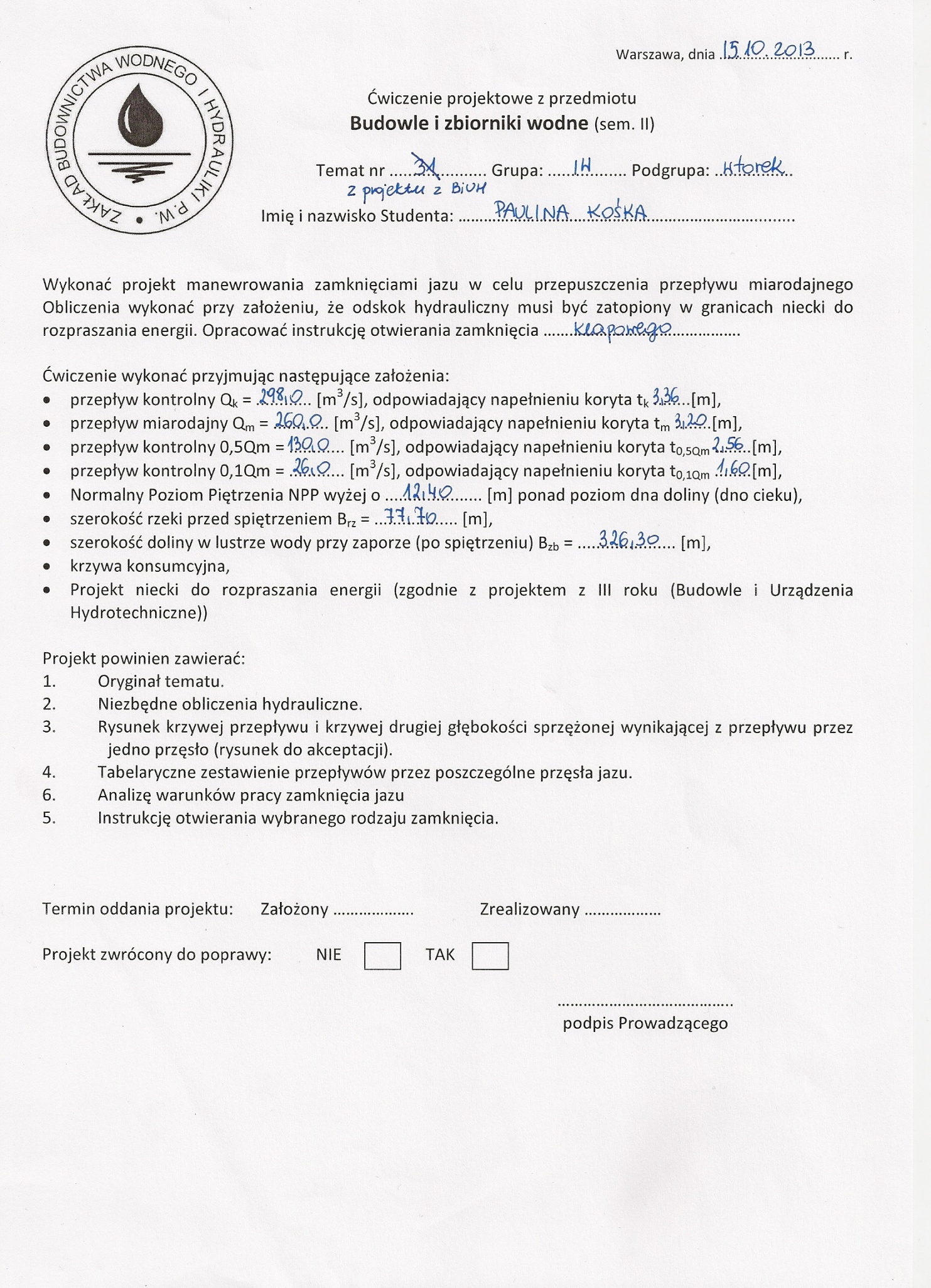 Celem tworzenia poniższej instrukcji jest zapewnienie zatopienia odskoku hydraulicznego w obrębie niecki wypadowej, tak aby uniknąć zjawisk niepożądanych, tj. rozmywania dna za niecką.
