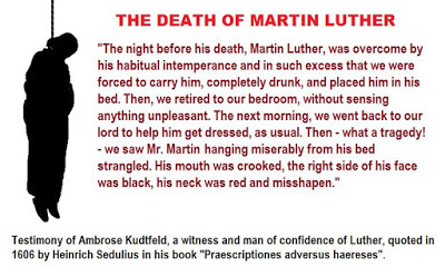 Jak pisze Villa, "Luter nie zmarł śmercią naturalną, jak fałszywie pisano w protestanckich podręcznikach historii, a zmarł jako samobójca, zwisał z łóżka po wspaniałej kolacji, podczas której, jak zwykle, wypił zbyt dużo i najadł się bez umiaru!" [10]