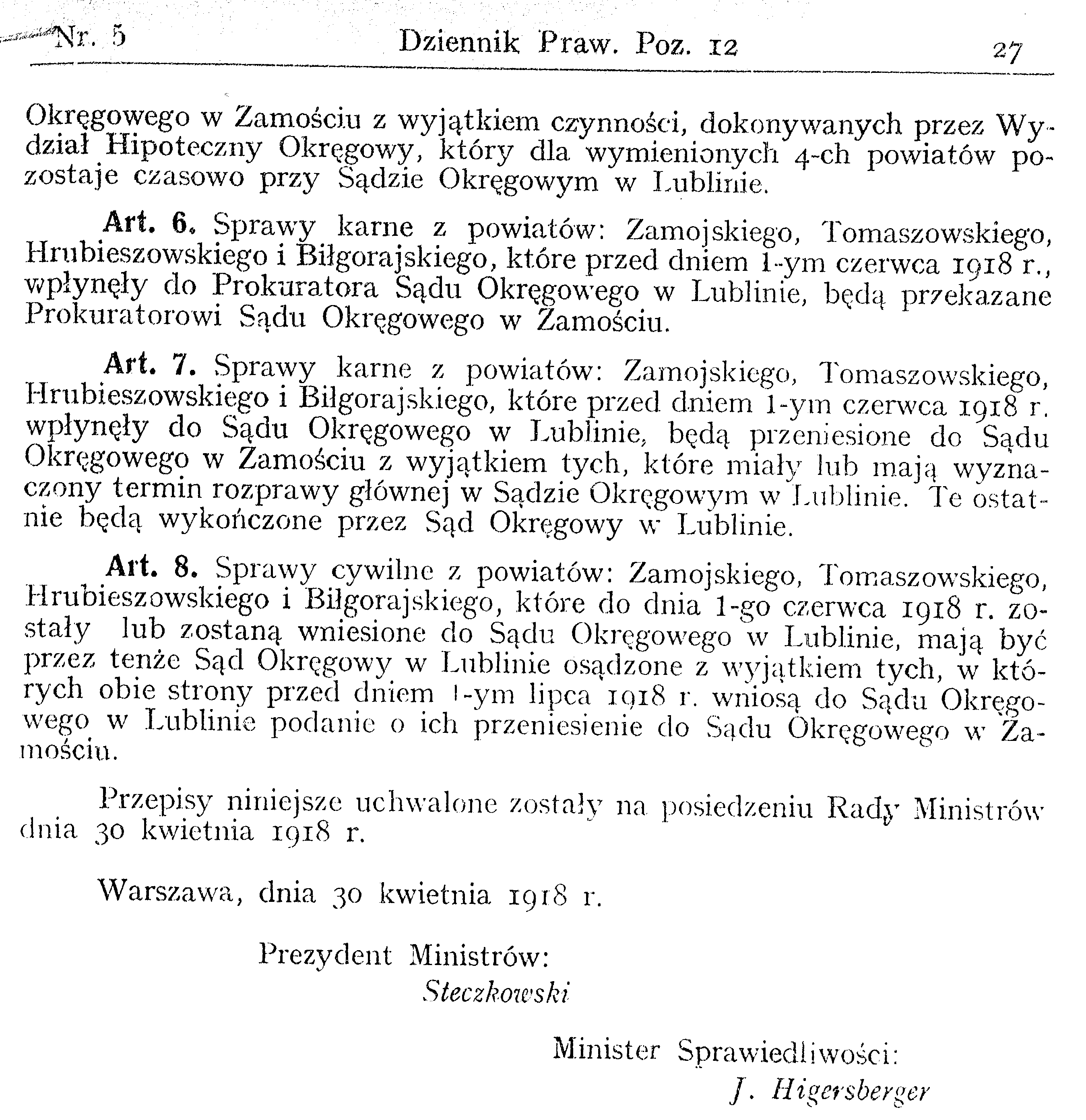 D19180005 Dekret Rady Regencyjnej Królestwa Polskiego w przedmiocie zmiany dyzlokacji sądów