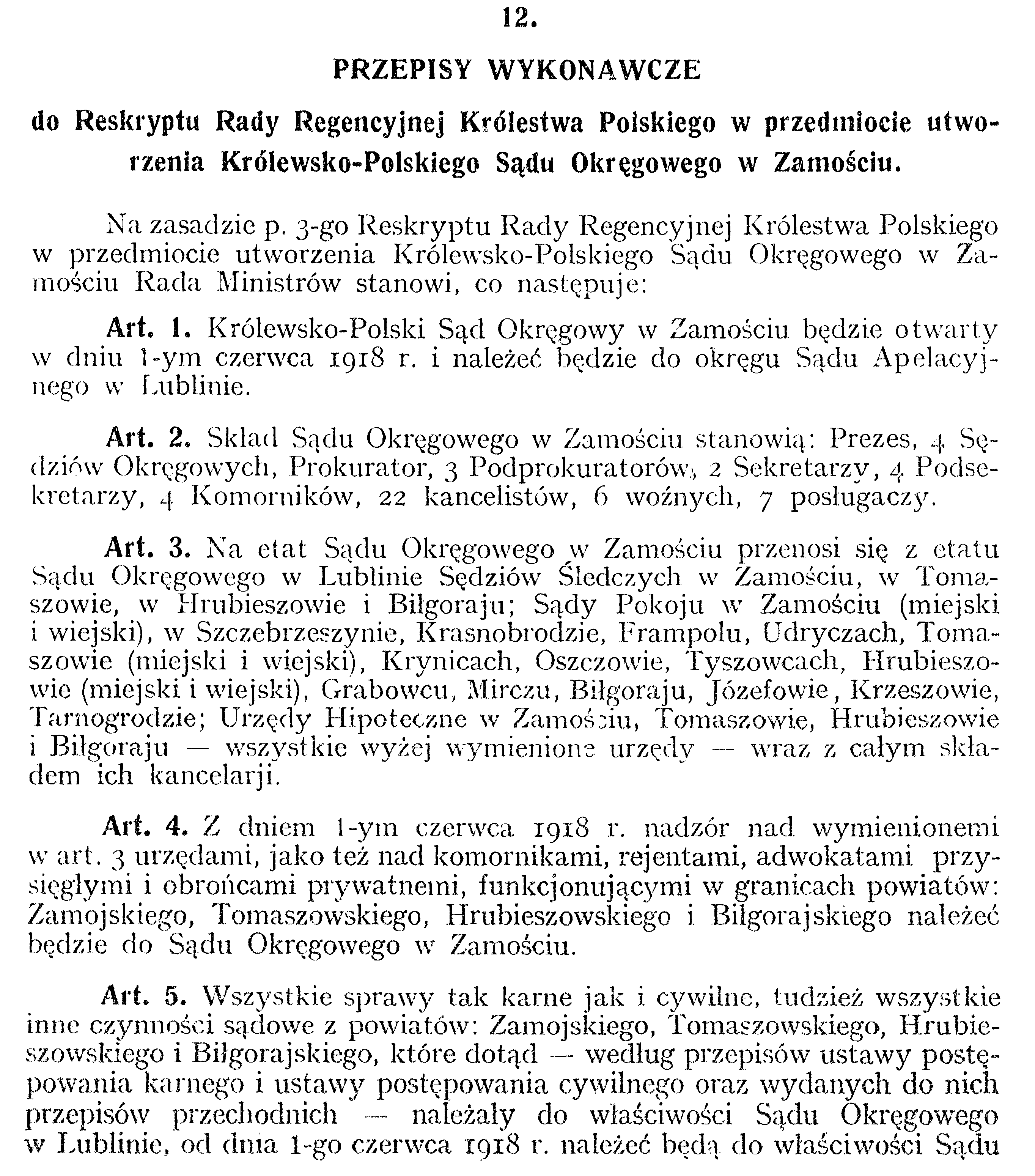 D19180012 Przepisy wykonawcze do reskryptu Rady Regencyjnej Królestwa Polskiego w przedmiocie utworzenia Królewsko Polskiego Sądu Okręgowego w Zamościu