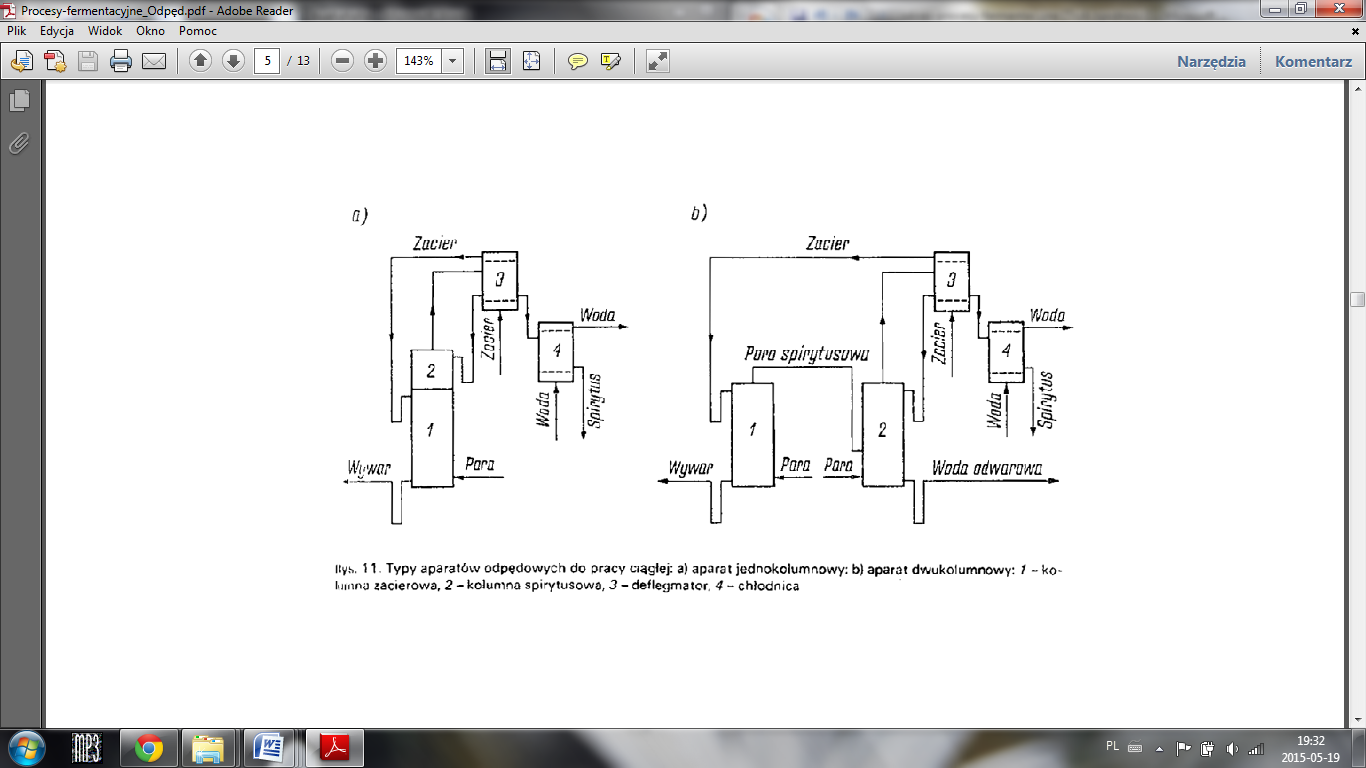 Proces biokonwersji cukrów na etanol, prowadzony przez drożdże Saccharomyces cerevisiae, trwa zwykle 3 doby w gorzelniach skrobiowych. Fermentacja alkoholowa jest to proces rozkładu węglowodanów pod wpływem enzymów wytwarzanych przez drożdże z wytworzeniem alkoholu etylowego i dwutlenku węgla: n(C6H12O6) = n(2C2H5OH) + 2CO2 + energia. FAZY: 1 zafermentowanie od 3 do 18h – faza adaptacyjna, intensywne namnożenie drożdży, determinowanie ilością tlenu rozpuszczonego w podłożu fermentacyjnym. 2 fermentacja główna 12-18h – właściwa, zahamowanie rozmnażania drożdży, intensyfikacja fermentacji, zwiększenie objętości, wydzielenie ciepła – wzrost temp. 3. dofermentowanie 20-30h- ostateczna hydroliza dekstryn pod wpływem enzymów,odfermentowanie pozostałych cukrów redukujących. Wydajność teoretyczna a praktyczna – teoretyczna wyliczana jest z równiania reakcji natomiast wydajność praktyczna to 89-92% wyd teoretycznej. Obniżenie wydajności spowodowany jest: syntezą prod ubocznych z dost cukrów, wzrostem drożdży, parowaniem alk, ulatnianiu alk z CO2, cukr nieodferment, inne.