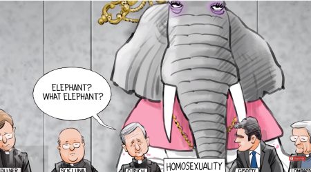 W 2002, Bishop Bruskewitz krzyknął na swoich braci biskupów: "ta nieszczęsna ława biskupów", kiedy zabrakło im moralnego kręgosłupa żeby zlikwidować epidemię homoseksualną wśród kleru.