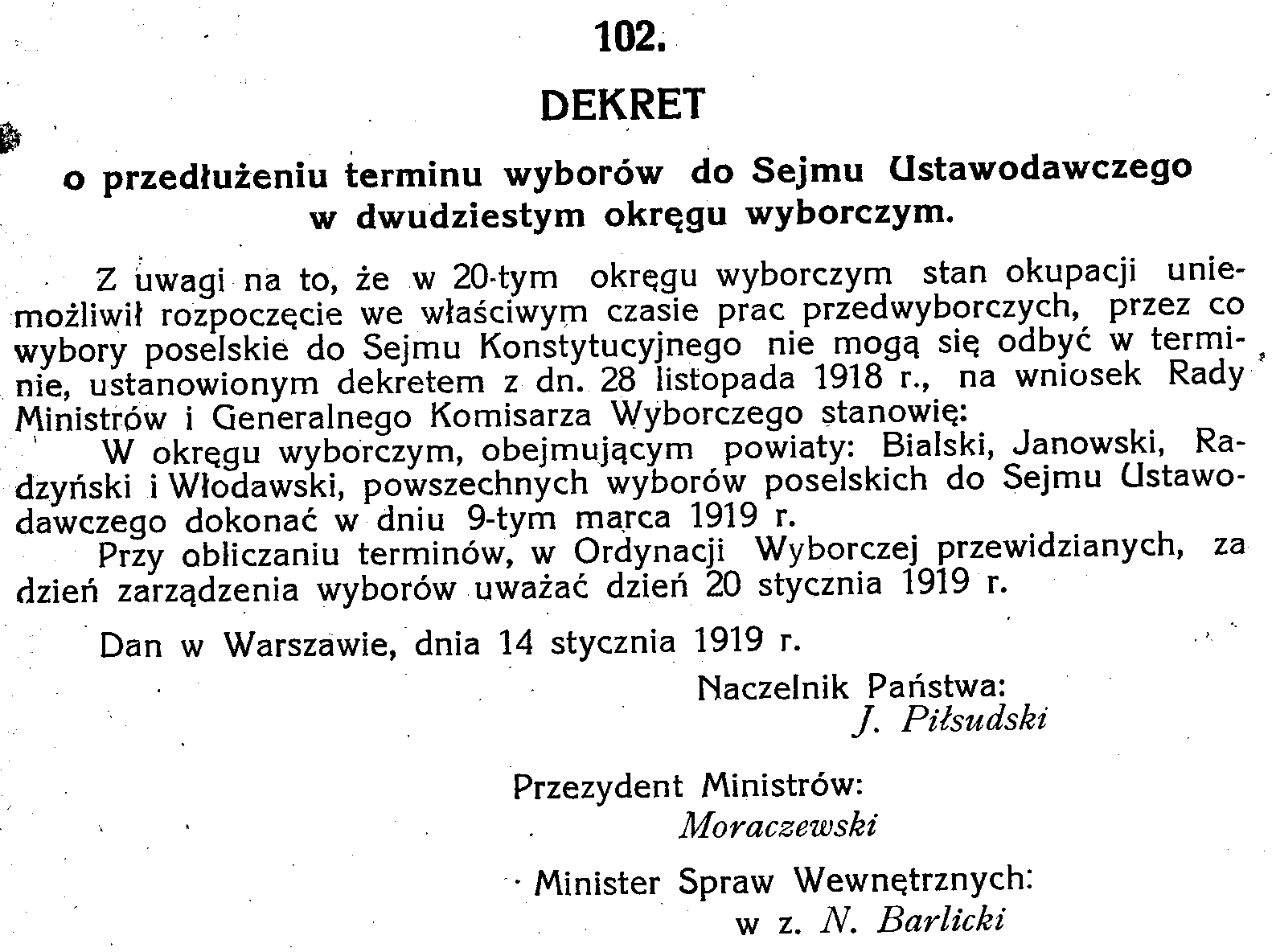 D19190102 Dekret o przedłużeniu terminu wyborów do Sejmu Ustawodawczego w dwudziestym okręgu wyborc
