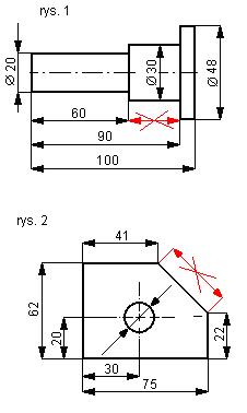 Na rysunku obok podczas wymiarowania popełniono szereg błędów: linie wymiarowe przecinają się, a jest to niedozwolone, nie wszędzie są wpisane liczby wymiarowe, na jednej z linii wymiarowych brakuje grotu strzałki, liczba wymiarowa (60) jest rozdzielona linią wymiarową, na rzucie poziomym (z góry) powtórzone zostały wymiary, które są już zaznaczone na rzucie pionowym (głównym). Niezastosowanie ogólnych i podstawowych zasad wymiarowania spowodowało, że rysunek jest mało czytelny i nie przekazuje w sposób jednoznaczny wszystkich informacji o przedmiocie.