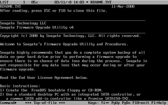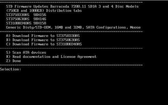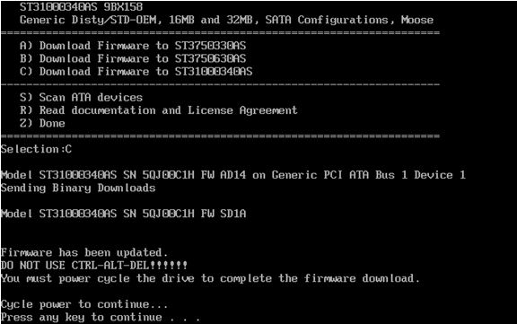 W tym przykładzie litera "C" rozpocznie pobieranie dla ST31000340AS. Należy pamiętać, że istnieją różne wersje firmware dla każdego modelu dysków.
