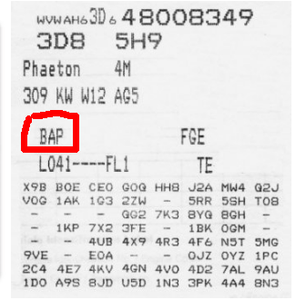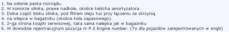 Jak znajdziesz w bagażniku taka naklejkę jak poniżej, to w miejscu które zaznaczyłem na czerwono jest nr silnika, a obok jest nr skrzyni.