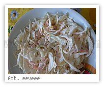 Marchew i kapuste pokrojic dodac kukurydze.Dokladnie wymieszzac ze smietana, doprawic sola i pieprzem. Przed podaniem schlodzic