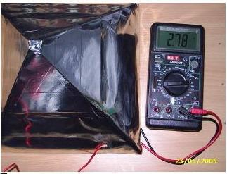 W prawym dolnym rogu gdzie (+) i (-) – podłącz „tester” (miernik napięcia) i spójrz na wynik. Różne wartości dla różnych wersji – ale można uzyskać napięcie 1,2-2,5 V z piramidą około 20 cm. Powinno wystarczyć na zasilenie zegara i małego radia … A jeśli zbudujemy większy to uzyskamy więcej …