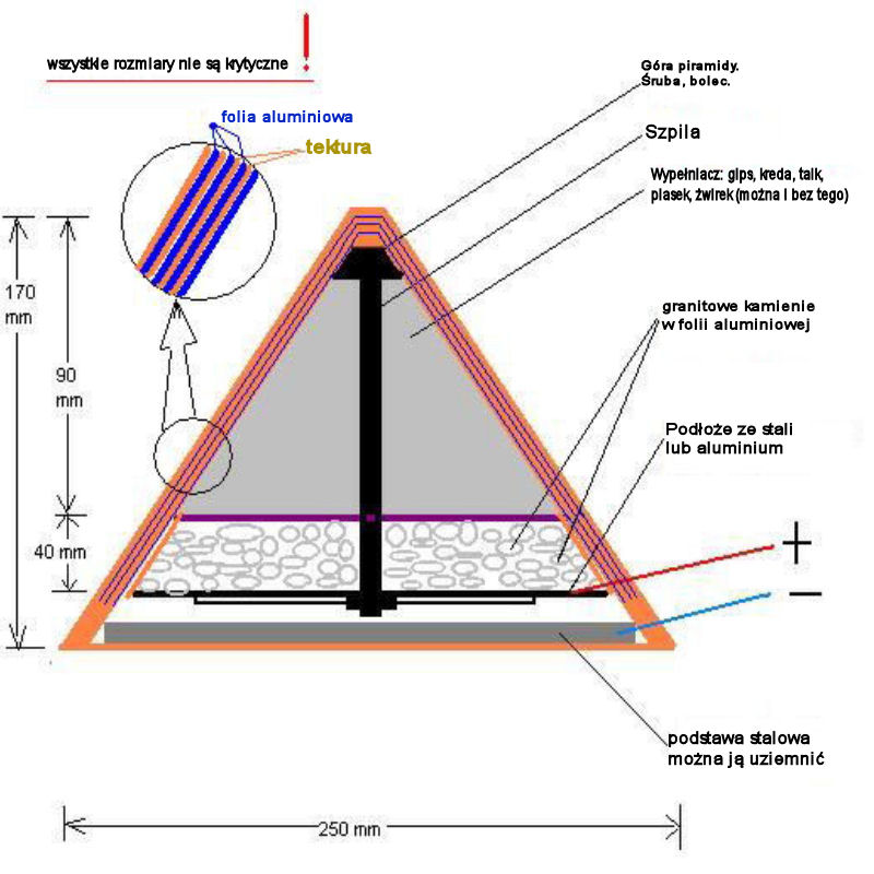 Samą piramidę robimy z warstw (patrz rysunek), najważniejsza jest kolejność: na zewnątrz jest „niemetalowa” (suchy karton, plastik itp.), A wewnątrz folia aluminiowa.