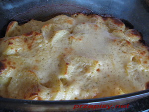 Potrawę tę możemy przygotować w inny sposób - bez sosu beszamelowego. Wówczas potrzebne nam będzie: ok. 1/4 litra mleka i ok. 1/4 litra słodkiej śmietanki. Ziemniaki polewamy równomiernie mlekiem i śmietanką - zapiekamy.