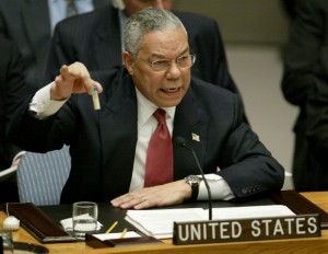 Colin Powell pokazuje fiolkę rzekomo zawierającą iracki wąglik na Zgromadzeniu Ogólnym ONZ.
