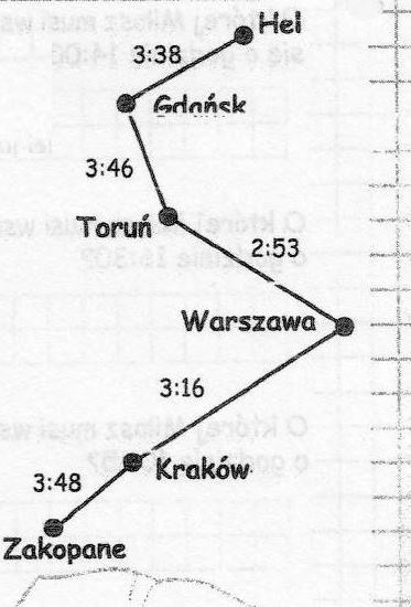 Łukasz wybiera się pociągiem z Helu do Zakopanego. Wybrał połączenie z kilkoma przesiadkami. Przyjrzyj się notatkom Łukasza i oblicz, ile czasu chłopiec spędzi w pociągu w trakcie tej podróży.