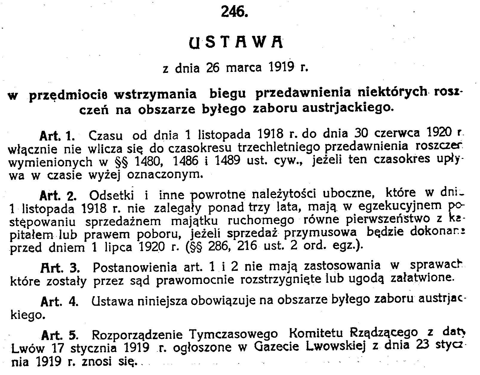 D19190246 Ustawa z dnia 26 marca 1919 r w przedmiocie wstrzymania biegu przedawnienia niektórych roszczeń na obszarze byłego zaboru austrjackiego