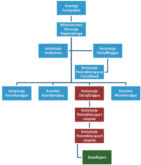 Na każdym z tych poziomów działają inne instytucje. Są to więc: Instytucje Koordynujące i Monitorujące – na etapie koordynacji i monitoringu; Instytucje Zarządzające – na etapie zarządzania oraz Instytucje Pośredniczące i Wdrażające – na etapie wdrażania. Dodatkowo, w ostatnim etapie uczestniczą także Instytucje Certyfikujące i Instytucja Audytowa.