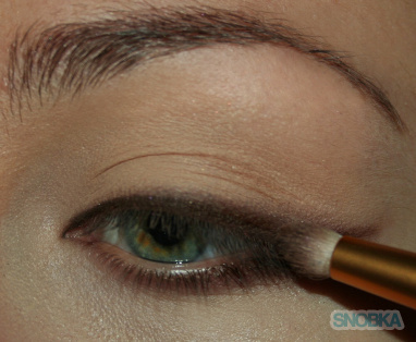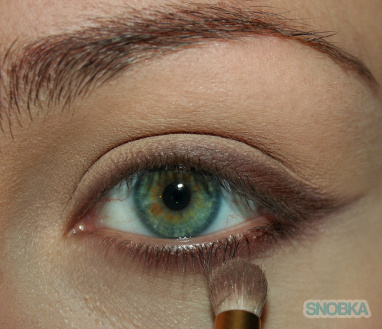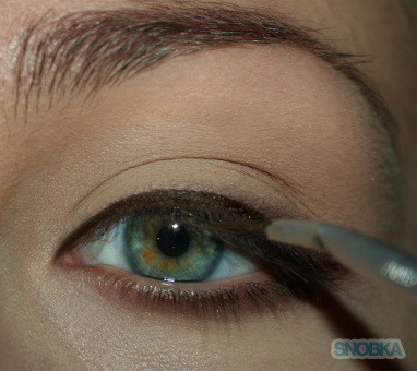Rozetrzyj eyeliner i kredkę pędzelkiem i odrobiną brązowego, matowego cienia.