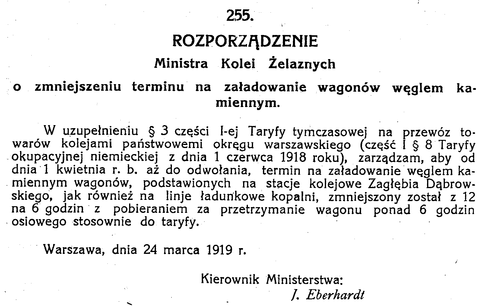 D19190255 Rozporządzenie Ministra Kolei Żelaznych o zmniejszeniu terminu na załadowanie wagonów węg