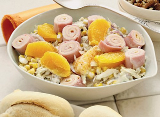 Kapustę, cebulę, kukurydzę, pomarańcze i orzechy wymieszaj ze