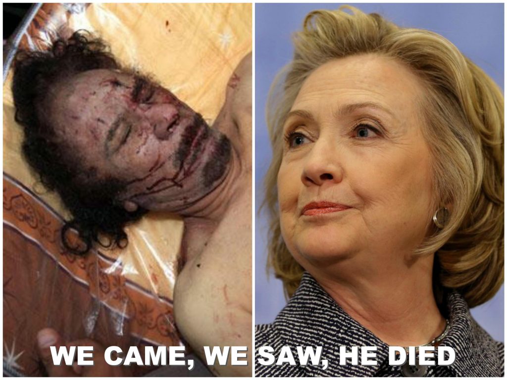 W kampanii prezydenckiej w 2008, Hillary Clinton zagroziła "całkowitym zniszczeniem" Iranu bronią nuklearną. Będąc sekretarzem stanu za Obamy, uczestniczyła w obaleniu demokratycznego rządu w Hondurasie. Jej udział w zniszczeniu Libii w 1012 był niemal radosny. Kiedy libijskiego lidera płk Kadafiego publicznie zsodomizowano nożem – mord umożliwiony przez amerykańską logistykę – Clinton triumfowała jego śmiercią: "przybyliśmy, zobaczyliśmy, i on umarł".