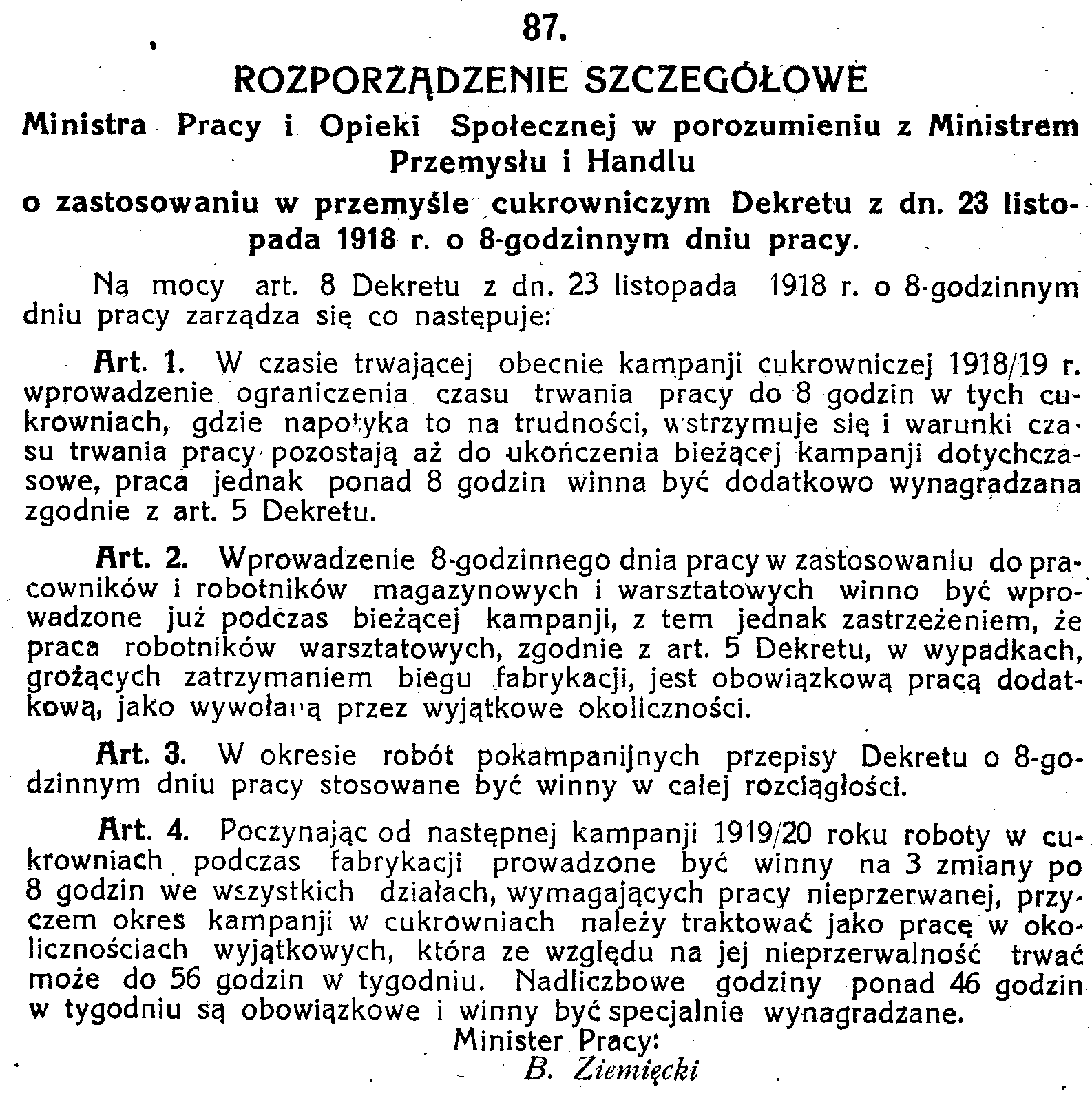 D19190087 Rozporządzenie szczegółowe Ministra Pracy i Opieki Społecznej w porozumieniu z Ministrem Przemysłu i Handlu o zastosowaniu w przemyśle cukrowniczym Dekretu z dnia