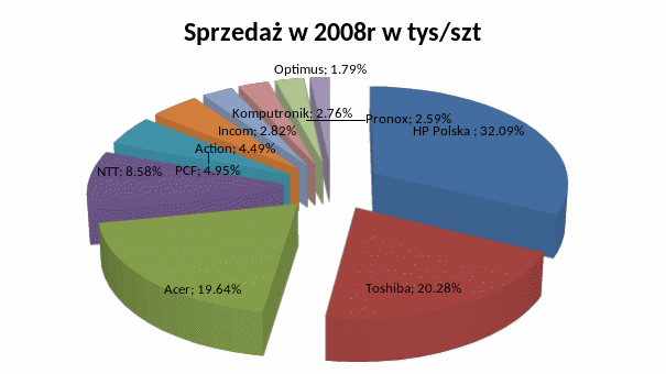 W 2008 r. najwięcej komputerów nad Wisłą sprzedał HP Polska (557 tys. sztuk), a następnie Toshiba (352 tys. sztuk) i Acer (341 tys. sztuk). Znakomita większość to notebooki. Trzech wymienionych liderów sprzedało ich odpowiednio: ok. 420 tys. sztuk, 352 tys. i 337 tys. Osiągnięcia polskich sprzedawców pecetów w świetle powyższych danych wyglądają mizernie.
