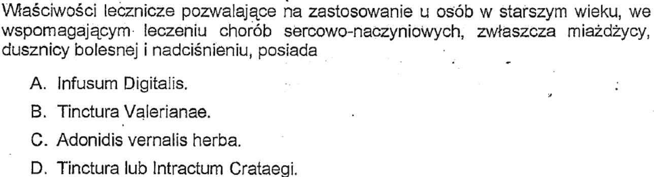 Pytanie 16 (ZIMA 2012) W wyniku ekstrakcji wodą wysuszonego korzenia wymiotnicy otrzymuje się lek w postaci? maceracji. odwaru. naparu. nalewki. |