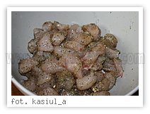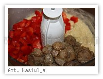 Mięsko drobno pokroić, posypać przyprawami: pieprz, vegeta, majeranek, odstawić. W tym czasie składniki na ciasto zagnieść, następnie dodac posiekaną paprykę i zamarynowane mięsko: